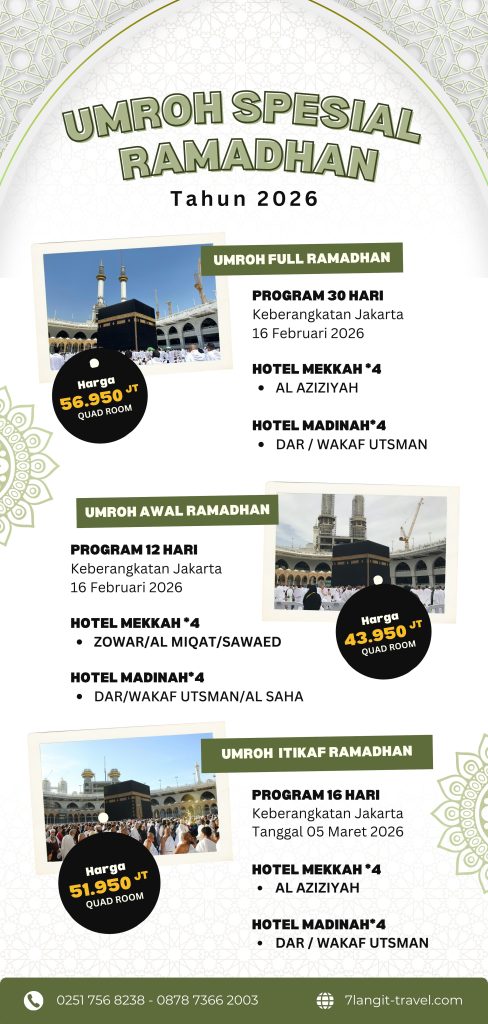 Raih kesempatan beribadah di Tanah Suci pada bulan penuh berkah. Program Umroh Ramadhan 2026 menghadirkan pilihan paket Awal Ramadhan, Akhir Ramadhan hingga Full 30 Hari, dengan akomodasi hotel dekat Masjidil Haram & Nabawi, bimbingan ibadah bersama ustadz, serta fasilitas lengkap.