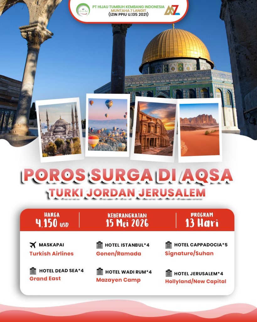 📍 Destinasi: Istanbul – Cappadocia – Dead Sea – Wadi Rum – Jerusalem – Aqsa